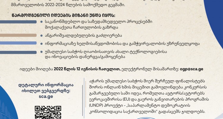 - იდეები მიიღება - 2022 წლის 12 ივნისის ჩათვლით, ელექტრონულ მისამართზე: ogp@sca.ge.